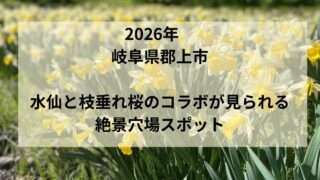 自己紹介 【2026年最新】岐阜県郡上市「緑水庵」の水仙と枝垂れ桜が絶景!見頃・駐車場・アクセスまとめ 岐阜県郡上市明宝小川の「緑水庵」は、約6万本の水仙と枝垂れ桜が楽しめる絶景スポット。見頃や駐車場情報、所要時間、実際の感想を写真付きで詳しく紹介します。 2026.04.12 自己紹介