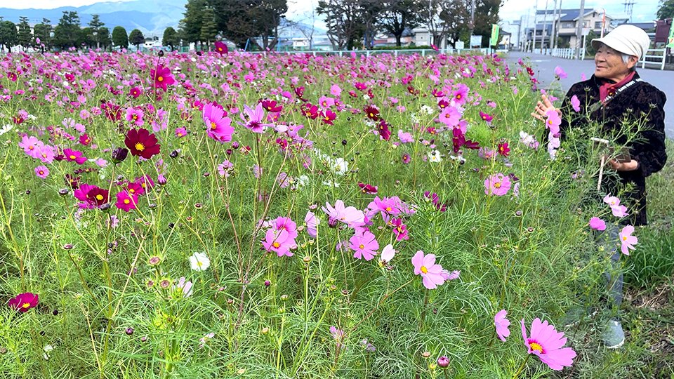 中曽根町活動組織が種をまき、約34万本のコスモスが今月初旬から咲き始めました。